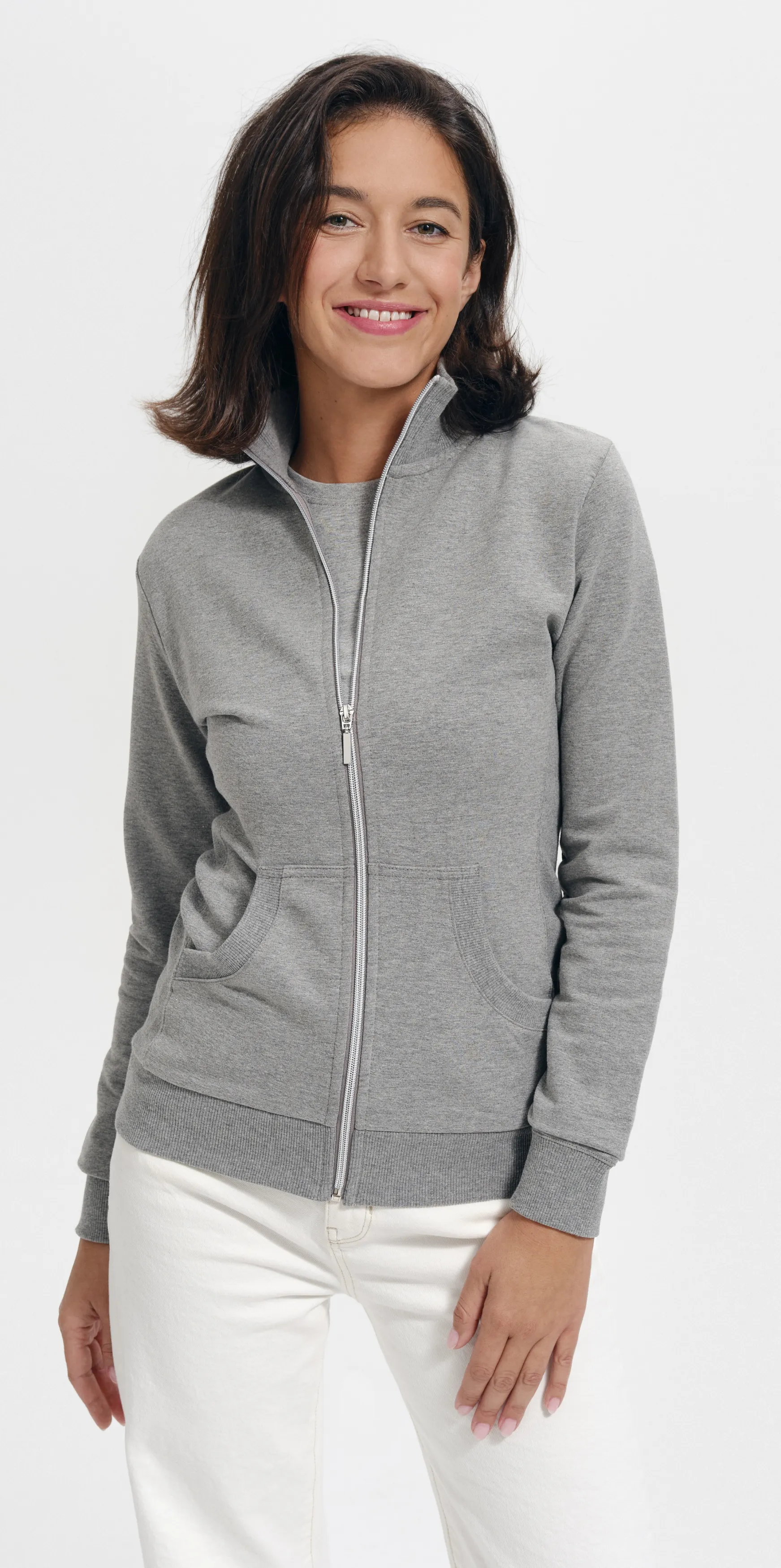 Damessweatshirt met voorzakken, zonder capuchon, met ritssluiting.